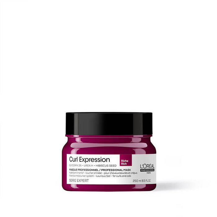 Blame Mother Nature: The spiraling structure of a curl or coil makes it so moisture has a very hard time traveling all the way down from root to end. The result: Dry curls and coils! No longer: Run L’Oréal Professionnel Serie Expert Curl Expression Intensive Moisturizer Rich Mask through your curls and coils, and the creamy mask envelops each and every strand in intense hydration, high shine and a velvety feel that begs to be touched. Plus, it pre-detangles snags for breakage-free styling. Containing 2% Glycerin to help deliver lasting hydration, Urea H to help protect weakened curls, and Hibiscus Seed to help add moisture, strength, and softness, the expansive L’Oréal Professionnel Curl Expression family of products aims to supercharge curls and coils with exactly what they need to thrive: hydration and strength. Looking for a more luxurious mask for your curls? Intensive Moisturizer Rich Mask is your best bet in this family; it delivers extreme hydration with a weightless, high-shine, velvety finish. With 48 hours of frizz protection and 2x more conditioning* power, it maintains curls and coils—even the tightest—for those long stretches between washes and co-washes.