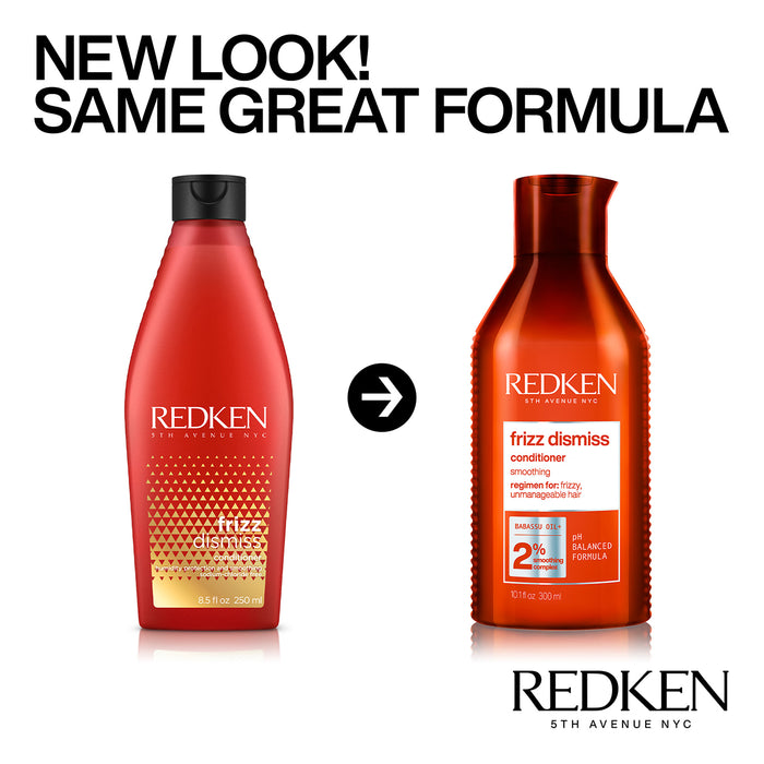 Redken Frizz Dismiss Conditioner is an anti-frizz conditioner that has a gentle, sulfate-free and sodium chloride-free formula to tame frizzy hair, increase smoothness and enhance shine. This conditioner is made with Redken's Smoothing Complex featuring sustainably sourced Babassu oil to moisturize, detangle and protect the hair from frizz while providing softness and shine.