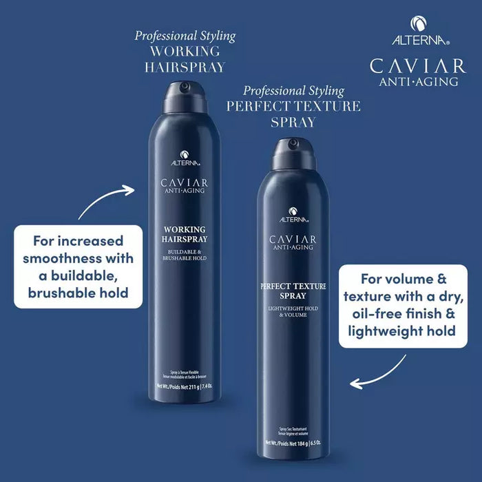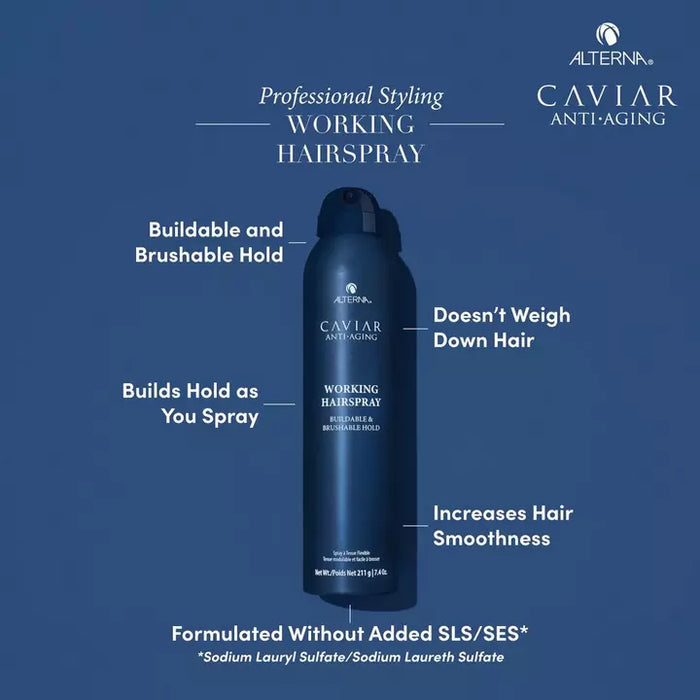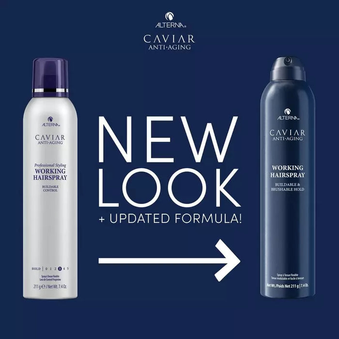 Alterna Caviar Anti-Aging Professional Styling Working Hairspray is a buildable to strong hold hairspray that feels non-sticky while maintaining hair's natural shine.