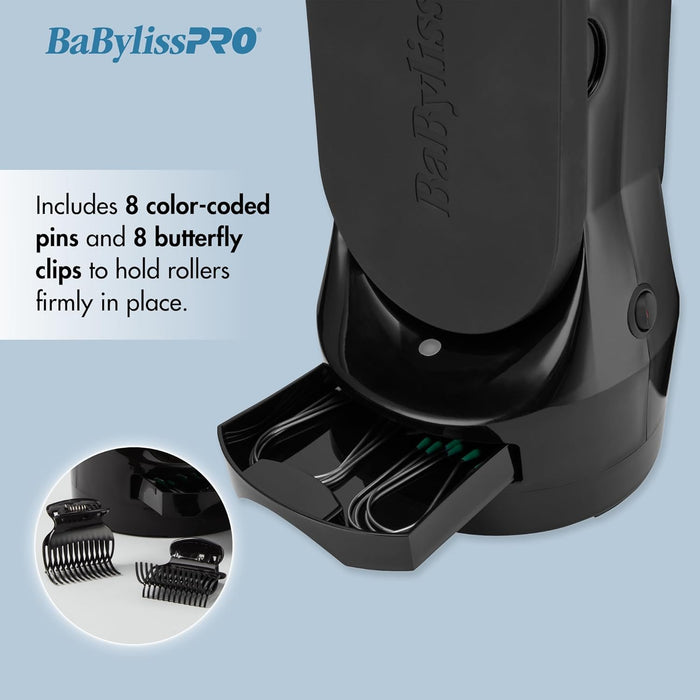 The BaBylissPRO Nano Titanium Compact Standing Hot Rollers set features an innovative vertical design that takes up less space and makes rollers easily accessible. The set has rollers in 2 sizes to create dynamic, dimensional curls.