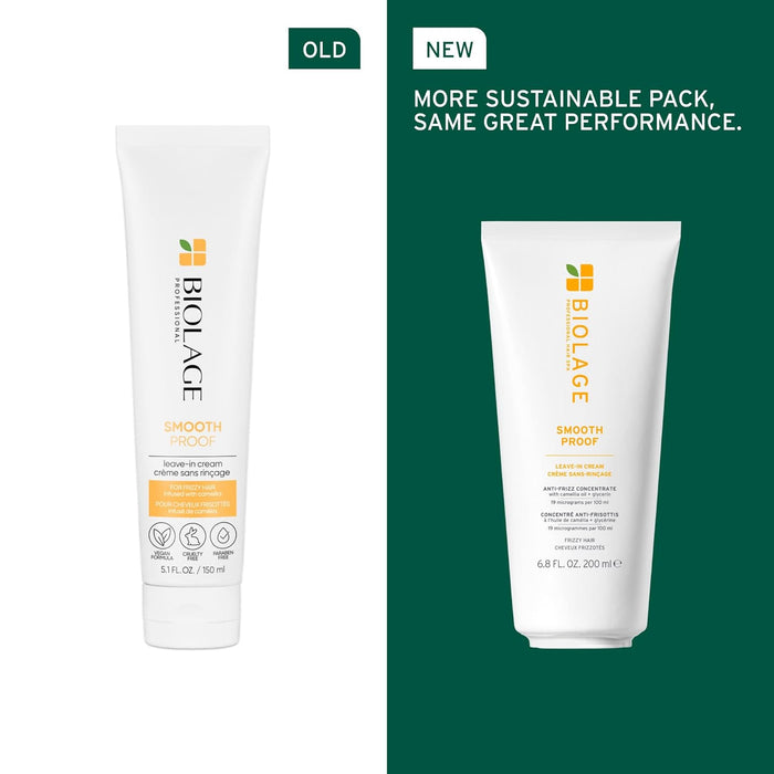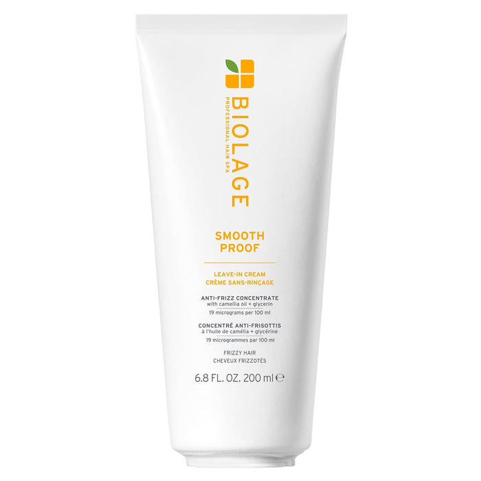 Biolage Smooth Proof Leave-In Cream is infused and micro-dosed with camellia oil and glycerin to control frizz, static, and flyaways, providing smoothness and shine without weighing hair down.