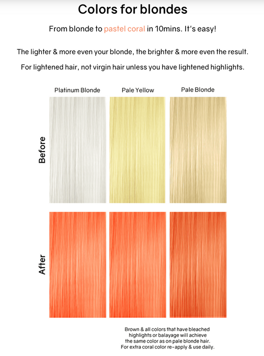 - Brown & all colors that have balayage or bleached highlights will achieve the same colors as on pale blonde hair.