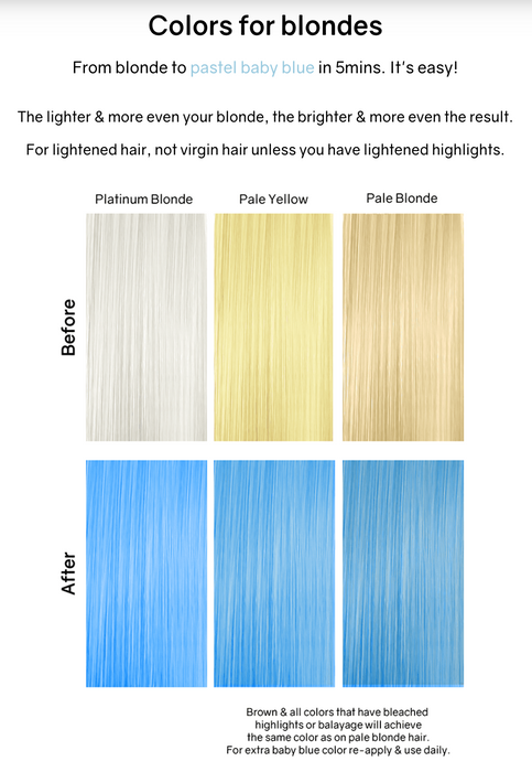 - Brown & all colors that have balayage or bleached highlights will achieve the same colors as on pale blonde hair.