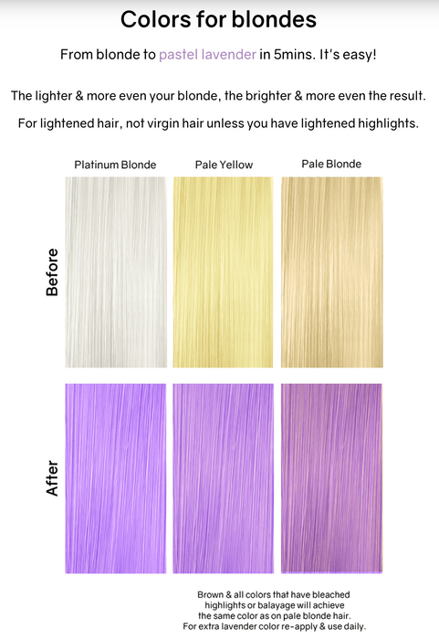 • Brown & all colors that have balayage or bleached highlights will achieve the same colors as on pale blonde hair.