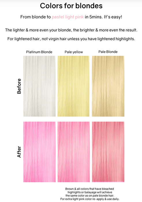 - Brown & all colors that have balayage or bleached highlights will achieve the same colors as on pale blonde hair.