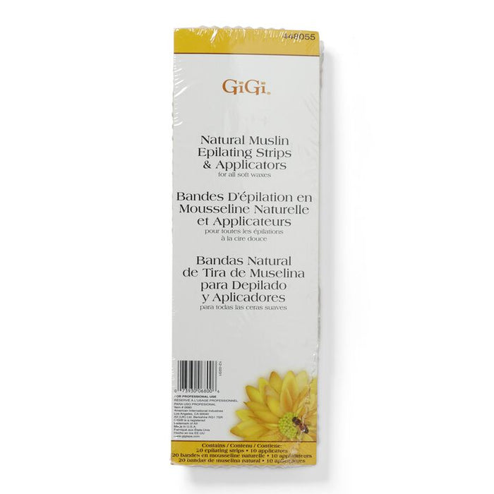 GiGi Natural Muslin Epilating Strips and Applicators are designed for use with all waxes and may be substituted for natural muslin strips. This combo contains 20 Epilating Strips and 10 Applicators.