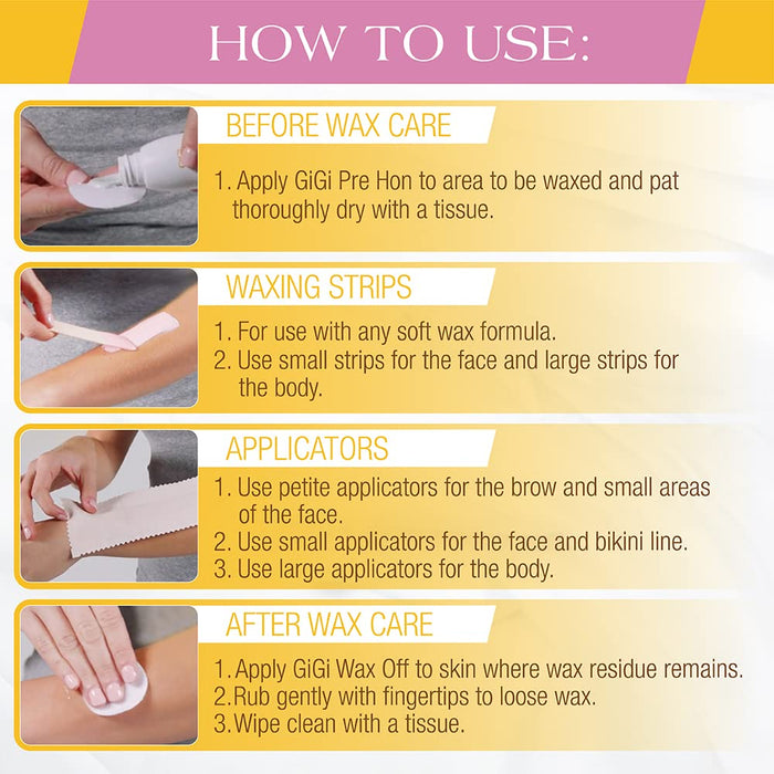 The GiGi Waxing Accessories Kit contains all the essential pre and post waxing treatments, applicators and cloth waxing strips for successful waxing.