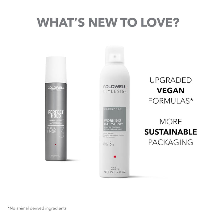 Goldwell Working Hairspray with Marine Bamboo instantly provides flexible hold and brilliant shine. Ideal for colored or stressed hair. This color-safe, vegan formula has a medium hold 3/5 and shine level 2/3 and is ideal for all hair textures. No animal-derived ingredients.