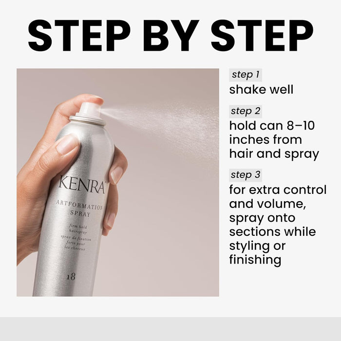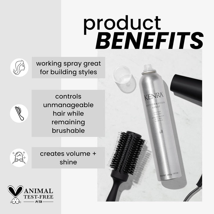 Kenra Artformation Spray #18 Hairspray provides instant volume and styling control. This fast-drying formula gives a firm hold, shiny finish, and can be brushed through for restyling.