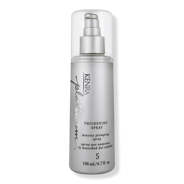 Kenra Platinum Thickening Spray 5 plumps each strand of hair by up to 96% after three applications and adds fullness and body to achieve the appearance of thicker hair. This flexible, humidity-resistant formulation provides a brushable, touchable hold for up to 24 hours.