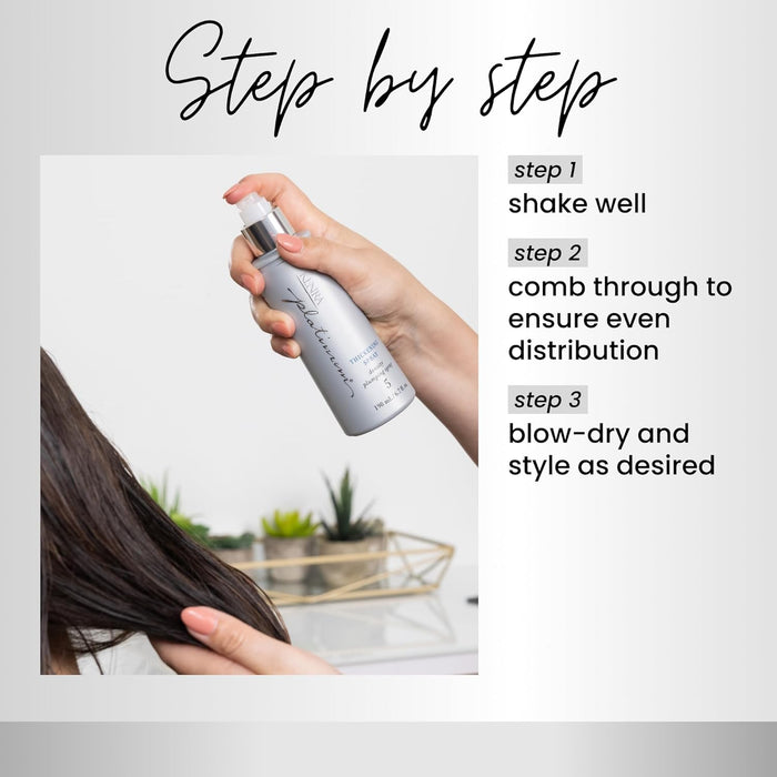 Shake well. Apply evenly to hair from roots to ends. Comb through to ensure even distribution. Blow-dry and style as desired. Reapply on dry hair and comb through for a refresh.