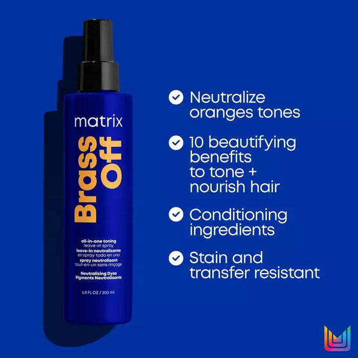 Matrix Brass Off All-In-One Toning Leave-In Spray is a buildable color depositing formula to neutralize unwanted brass, orange undertones in between salon visits to prepare hair for styling. Enriched with conditioning agents and neutralizing dyes to deliver 10 beautifying benefits.