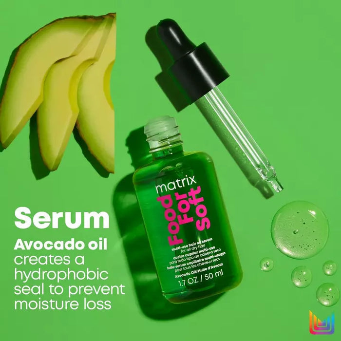 Matrix Food For Soft Multi-Use Hair Oil Serum, infused with avocado oil, is a leave-in treatment that helps to seal in hydration for hair that looks shiny and smooth.  Packaging may vary.