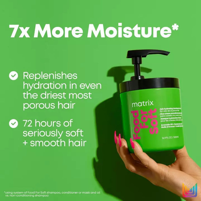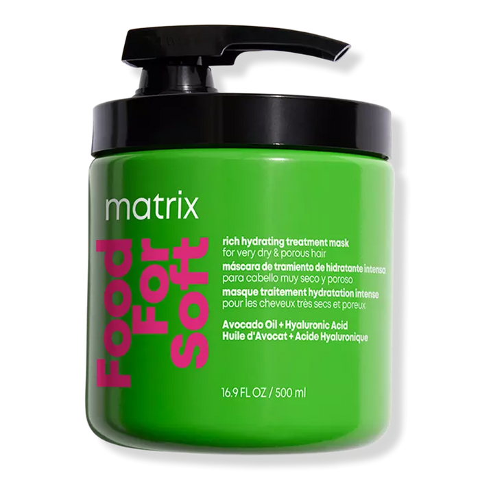 Matrix Food For Soft Rich Hydrating Treatment Mask infused with avocado oil + hyaluronic acid, replenishes hydration in even the driest & most porous hair, making it ideal for every wash.  Packaging may vary.