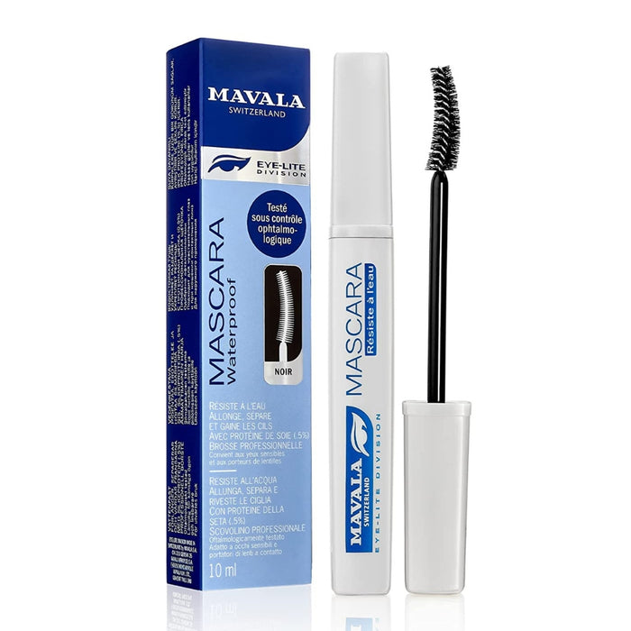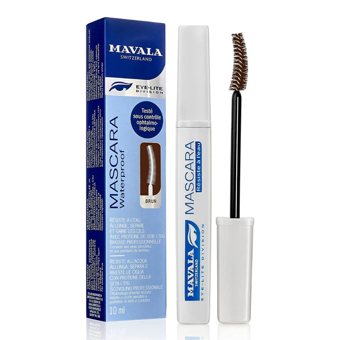Mavala Eye-Lite Waterproof Mascara contains a silk protein enriched formula to condition and protect eyelashes while enhancing their natural appearance. Thickens, fortifies and lashes appear longer while keeping them soft and silky. The professional curved brush separates lashes while lengthening and curling them and applies color uniformly. Long-lasting wear.