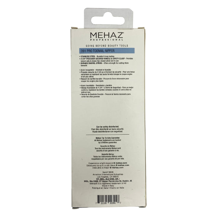Mehaz Professional 391 Pro Toenail Nipper is a stainless steel toenail clipper. This professional quality toenail nipper has groove textured handles for a great grip and easy use. This toenail nipper is squeeze-action and utilizes a double-barrel spring. Made from 100% stainless steel for long lasting quality.