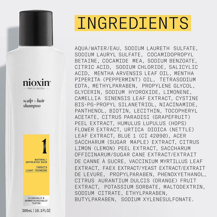 It prepares the hair and scalp for a complete hair thickening treatment with Nioxin’s three part System 1. This professional derma-purifying Cleanser Shampoo removes dirt, excessive oil and other environmental residues from the scalp and hair.