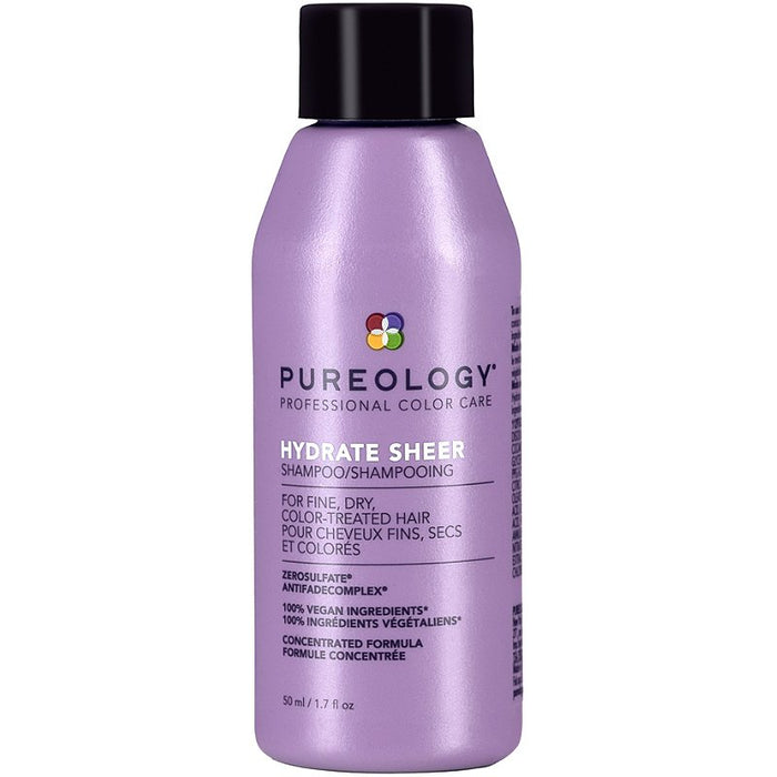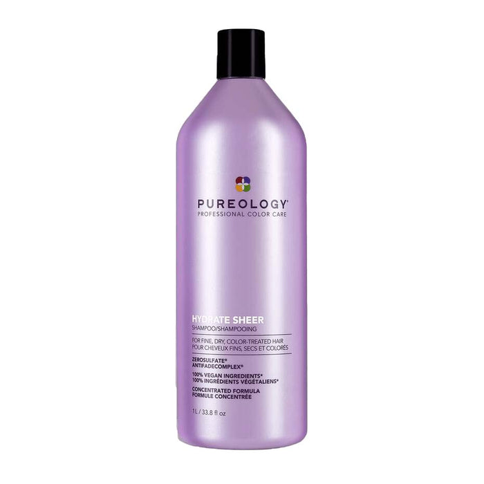 Pureology Hydrate Sheer Shampoo deeply hydrates fine dry, color-treated hair with key ingredients Jojoba, Green Tea, and Sage and a signature aromatherapy blend of Lavendar, Bergamot, and Patchouli. This formula is silicone-free for lightweight hydration.