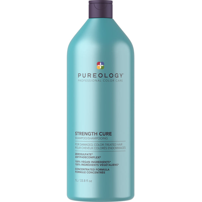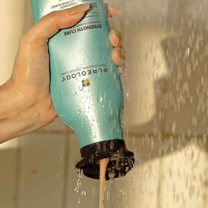 Pureology Strength Cure Shampoo fortifies and repairs damaged, color-treated hair with key ingredients Keravis and Astaxanthin and a signature aromatherapy blend of Raspberry, Peach, and Water Flowers.