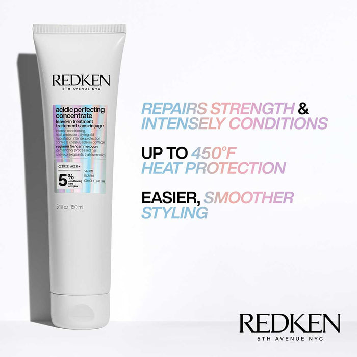 Redken Acidic Perfecting Concentrate Leave In-Treatment is Redken's most concentrated all-in-one formula for strength repair for all types of damaged hair. This conditioning leave-in treatment provides ultimate strength repair, intense conditioning and color fade protection. Featuring Citric Acid, this leave-in treatment contains a concentrated bonding care complex that reinforces weakened bonds within your hair to improve hair strength and resiliency. It repairs strength in damaged hair strands, provides heat protection up to 450 degrees, tames frizz, adds shine and reduces hair breakage. This pH-balancing leave-in treatment is specifically formulated with an acidic pH to defend against the negative effect of hair coloring, styling tools, and even water, which has a pH of 7, to balance hair's pH back into a healthy range of 4.5-5.5. The result? Healthier looking and feeling hair.