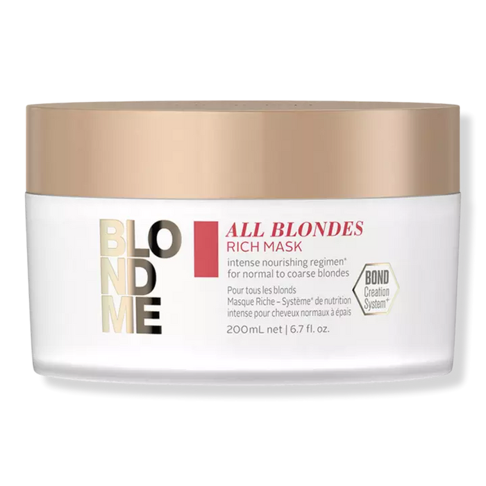 The BLONDME All Blondes Rich Mask, with 3D Bond Creation Technology and Cashmere Protein Complex, helps to build new bonds, while deeply nourishing normal to coarse blonde hair, leaving it feeling strong with a healthy-looking shine.