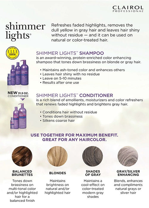 SHIMMER LIGHTS Conditioner Blonde & Sliver is a rich blend of emollients moisturizers and color refreshers that renews faded highlights and brightens gray hair. Use Shampoo and Conditioner together for maximum benefit.