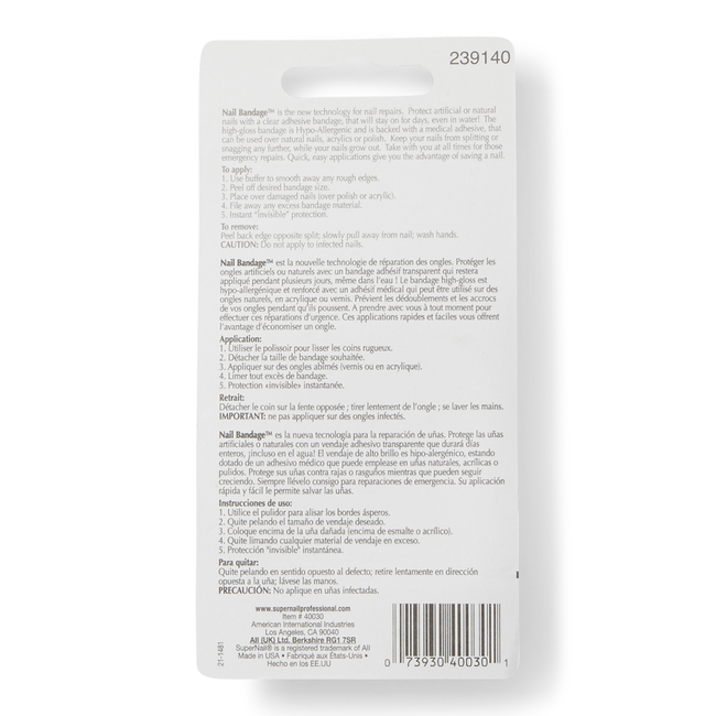 Super Nail Nail Bandage Instant Nail Repair lets you protect artificial or natural nails with a clear adhesive bandage, that will stay on for days, even in water. Keeps your nails from splitting or snagging any further, while your nails grow out.