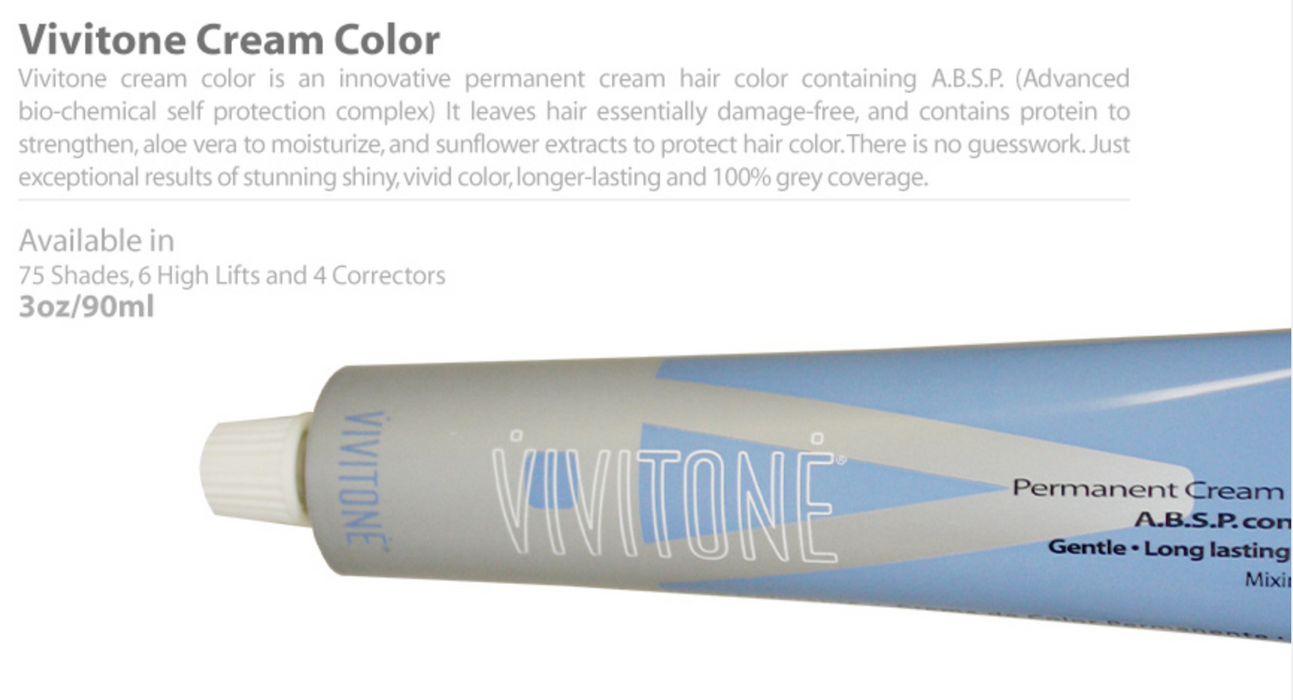 Vivitone cream color is an innovative permanent cream hair color containing A.B.S.P. (Advanced Bio-Chemical Self Protection Complex). It leaves hair essentially damage-free, and contains protein to strengthen, aloe vera to moisturize, and sunflower extracts to protect hair color. There is no guess work; just exceptional results of stunning, shiny, vivid color, longer-lasting and 100% grey coverage. Available in 75 Shades, 6 High Lifts and 4 Correctors. Made in Italy. 3oz. Tube. Mixing Ratio 1:2.